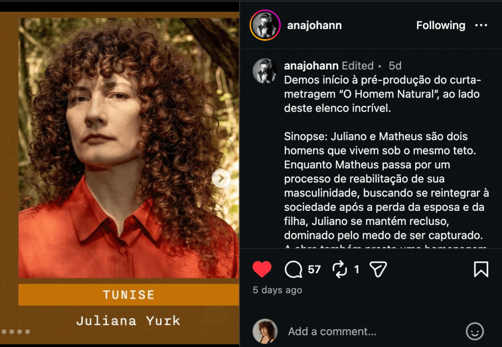 Escalada para o curta metragem O Homem Natural de Ana Johann, vivendo a personagem Tunise. Gravação ocorre no Paraná no final de abril de 2026.